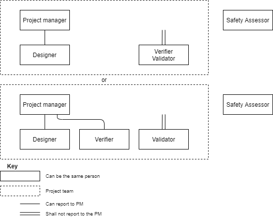 The illustration above shows two possible role distribution models indicating how the project organisation has to be structured for an SIL4-rated project. What’s evident here is that the verifier may in principle be subordinate to the project manager, provided that the same person doesn’t also perform validation-related tasks.